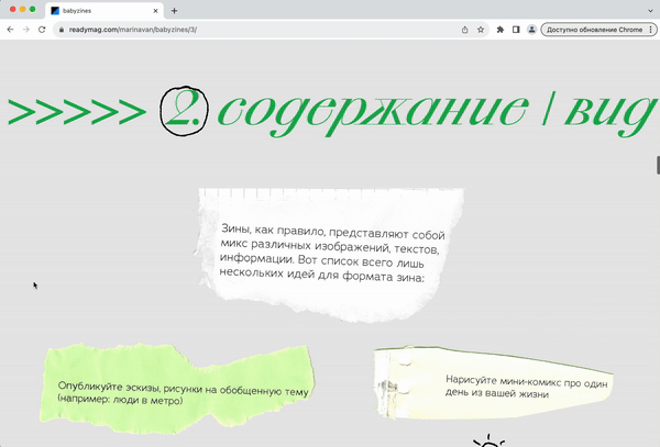 Как, из чего и про что сделать маленький зин? Шаг за шагом лонгрид «baby zine: how to» и забавный проводник — человечек в беретике — расскажет как выбрать тему, развить её, подобрать материалы, настроиться на абсолютное самовыражение, растиражировать уникальные бэби-зины, которые 15×10,5 см отроду.